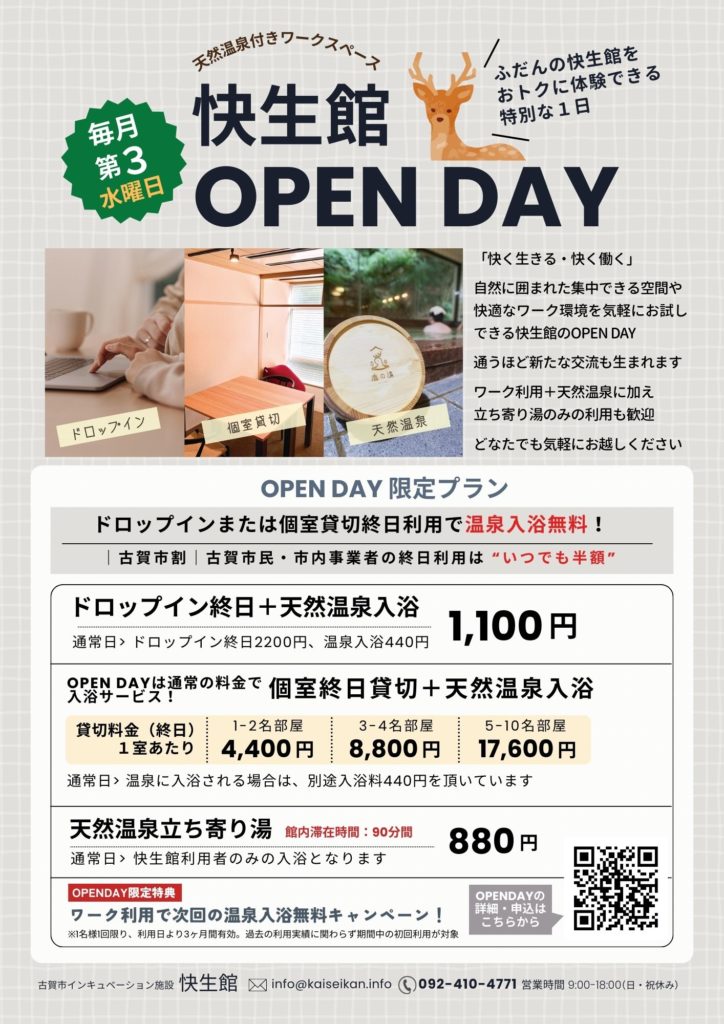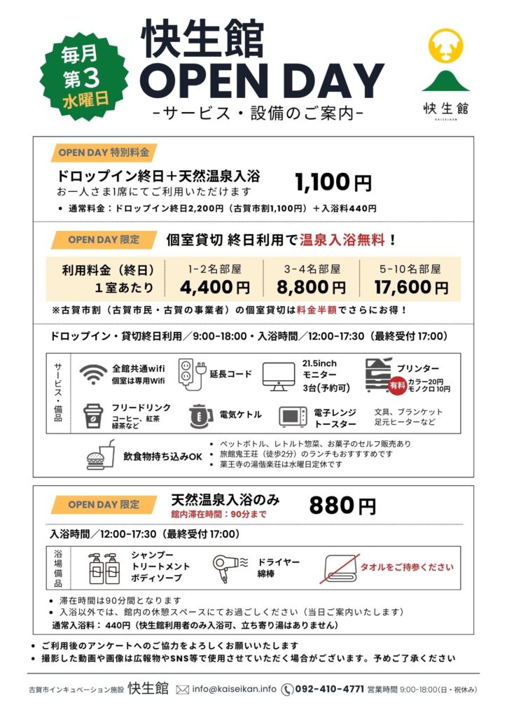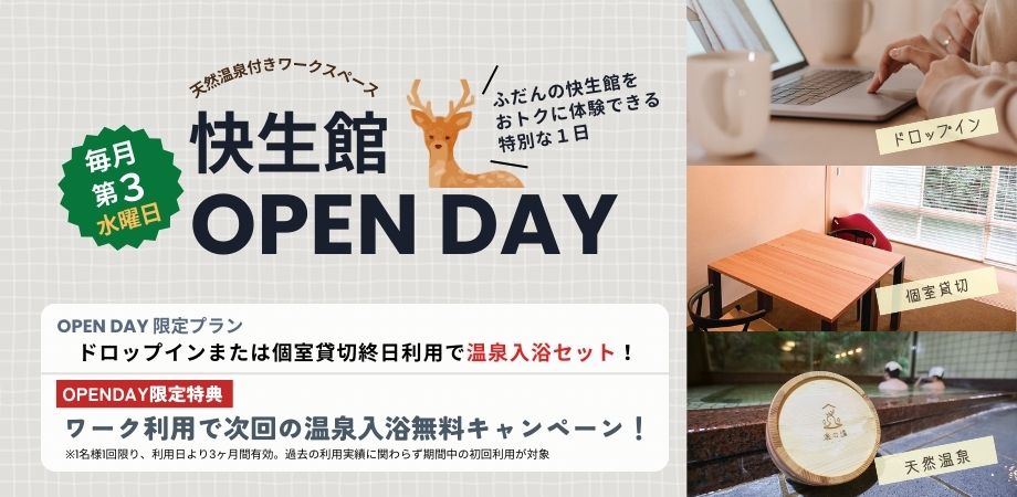 「快く生きる・快く働く」快生館を気軽にお試しいただける1日。月に一度のこの機会を、ぜひご活用ください。